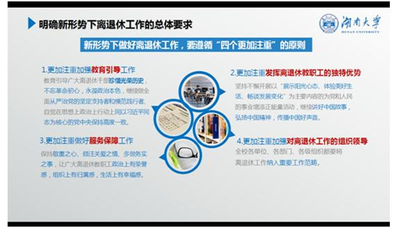 会上离退休处刘慧讲述了:关于进一步加强和改进离退休工作的实施意见,要求加强离退休教职工的思想政治建设和党组织建设,发挥离退休教职工正能量作用。