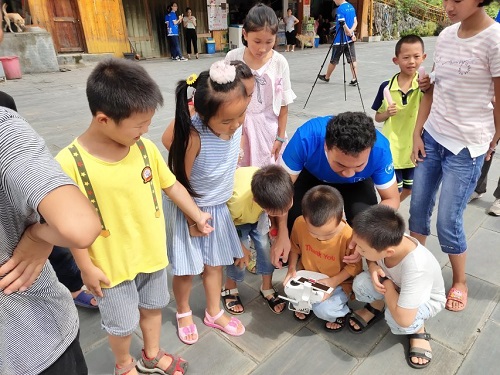 无人机课是孩子们最期待的课程之一,团队成员张之亮首先向孩子们讲解了无人机的结构、分类和用途,之后他根据孩子们回答问题的情况选出了六名同学实地操控无人机。这六名同学在团队成员的帮助下遥控无人机飞上了天空。看到无人机越飞越高,孩子们欢快地跳起来。将无人机引入支教课堂,不仅仅激发了孩子们对科学的兴趣,更在他们心中埋下了名为梦想的种子,希望孩子们的梦想也能像无人机一样高飞于空。
