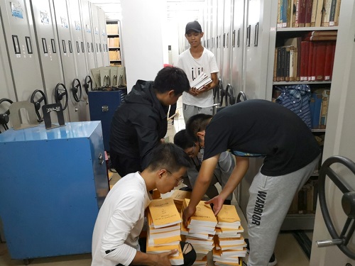 由于在图书馆,同学们都非常注意控制说话的音量,尽量在不影响其他同学学习的情况下完成工作。同学们都保持着足够的热情,全身心地投入自己的工作。搬书架的男生们喊着口号,齐心协力;进行杂志归位的女生们不放过书架的任何角落,仔细寻找。值得一提的是,进行图书分类的男生们发现采用各自抱书再运往书架的工作方式效率不高,于是决定流水作业,排成一排进行传递,这样既减小了工作强度,又提高了工作效率。