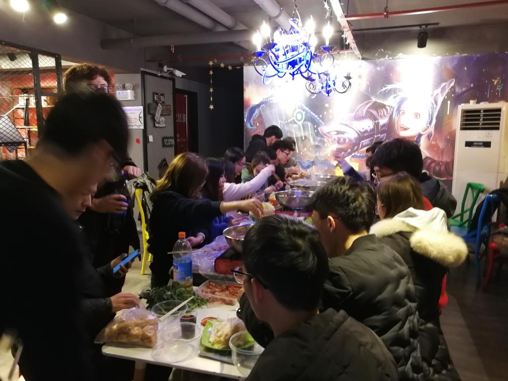 班长王婷同学早早到达聚会地点进行统筹规划,六名班委紧张有序地相互配合对场地进行布置,提前到达的同学们也积极地参与到准备活动中。在采购、洗菜等繁琐的准备工作被有条不紊地完成以后,全班同学紧紧围坐在一起享用冬日的火锅。温暖的热气和同学们的欢声笑语充斥着整个房间,彼此在此刻更加紧密,更加团结。