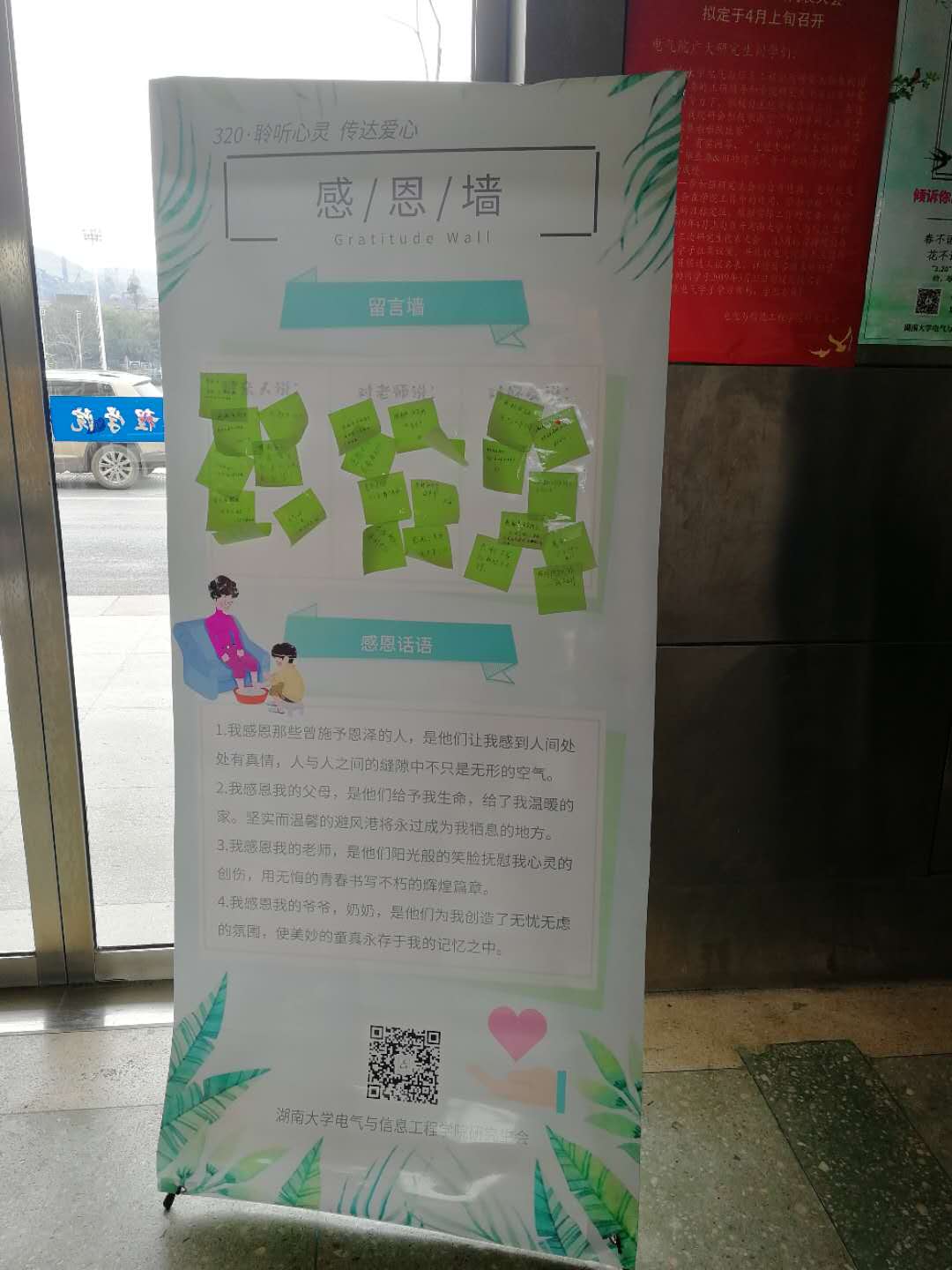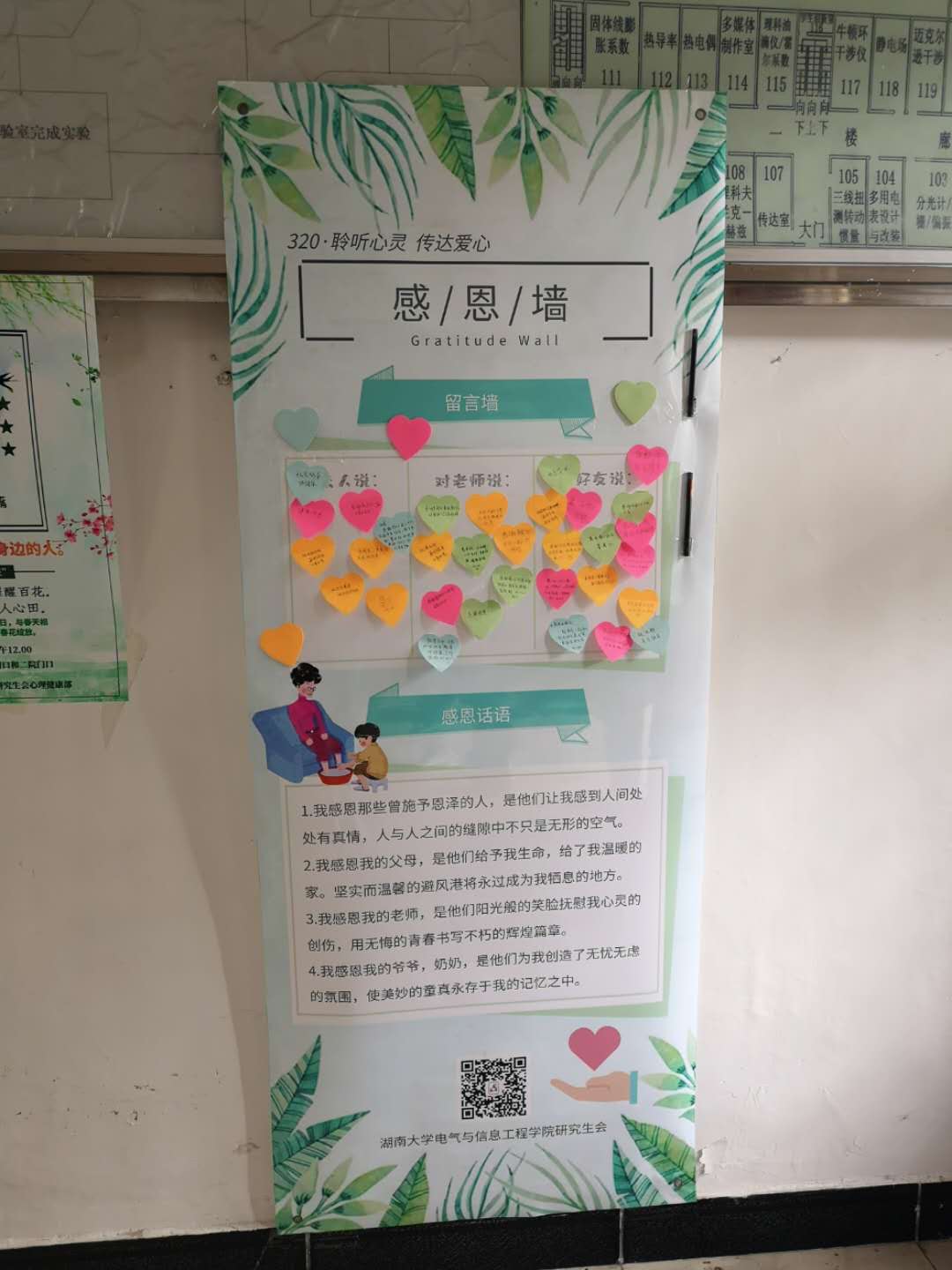 此外本次活动的感恩墙分别在电气院院楼门口和二院门口持续展示了一周,平时路过的同学也积极写下了自己对身边人的感恩与祝福,传达了自己的一份爱心。