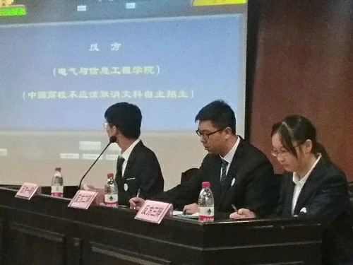 本次决赛的辩题为“中国高校是否应该取消文科自主招生”,电气院辩论队的持方为反方,正方为法学院辩论队。正方从文科相较于理科更具有主观性这一角度切入,接着列举了文科的主观性带来的腐败、造假等种种问题。而反方则列举出了国家出台的几项关于自主招生的政策,并说明自主招生的制度正在不断的完善。双方在文科自主招生存在的问题能否得到解决这一问题上针锋相对。辩手们旁征博引,互不相让,将气氛推向高潮。比赛进入总结陈词环节,反方三辩结辩稿中优美的文字也让在场观众感受到了文科的魅力。