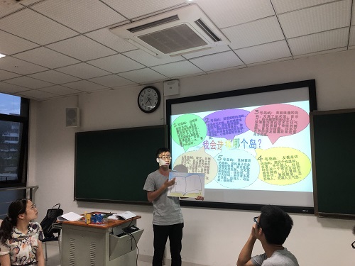 正式活动分为两个阶段,第一阶段是自我探索。彭老师先提出了一个热身小问题:自己迄今为止坚持最久的一件兴趣是什么?,借此勾引大家的兴趣。彭老师还给各位送上了“福利”,全班同学获得了去岛屿度假两个月的机会,教室里一共有六张桌子供选择,这六张桌子分别代表着六个岛屿,而六个岛屿也各有其特点。选定后每个岛推选出岛主介绍本组成员选择这个岛的原因。紧接着规则发生了改变,这次要选择的是想要生活一辈子的岛屿。经过短暂的思考,少数一部分同学改变了自己的选择。
