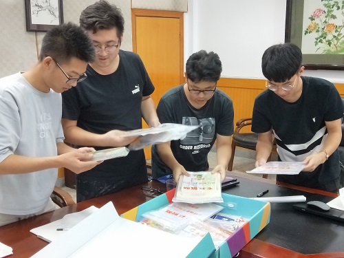 锲而不舍,金石可镂。前期团队的不懈努力终于有了回报。特色主题活动团队获得了由中国青年志愿者协会联合中国少年儿童新闻出版社制作的“七彩假期”活动包,而之前申报的“一带一路”专项实践活动也有了结果,大家也将开启一段全新的实践之旅。会议结束后,成员们一同激动地打开包裹,发放的物资也都是团队在接下来工作中所需要的。