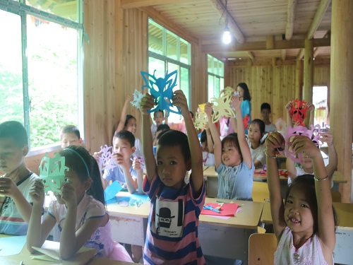 原先安静的屋子因为这群孩子的到来被重新唤醒。趣味剪纸课堂,气氛十分活跃,员工们按照老师的要求,认真完成自己的作品,并在上课过程中积极向老师请教。剪纸作品在小朋友天马行空的想象力下,窗花变成了王冠,变成了面具。体育课以抱团游戏开启,所有团队成员融入课堂,和孩子们一起手拉手,围成圆圈完成游戏,广场上充溢着孩子们和队员们的嬉闹声。独特的岩脚风光在这个时刻定格着孩子们与支教成员们的笑容,支教成员们与孩子之间的距离无限拉近。下午课堂精彩依旧,化学课,懂得了化学在生活中的实际应用,投影仪下观看微观下化学反应的神奇,孩子们很是惊叹;折纸课,一步步的带着小朋友们折着手中的彩纸,一个个小动物好像真的出现在了孩子们的课桌上。