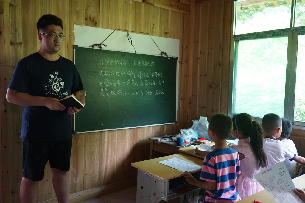 早晨8点,迎着似火的阳光,团队成员们早早的带着国旗和设备,来到了与孩子们约定的教室。在不大的教室里,孩子们端正的坐在座位上,眼神中透出求知的光芒,教授歌曲的团队成员在黑板上工整的写下词曲,“我和我的祖国,一刻也不能分割”,学会歌曲后,孩子们嘹亮的歌声飘扬在教室里,也在成员们心中留下印记。