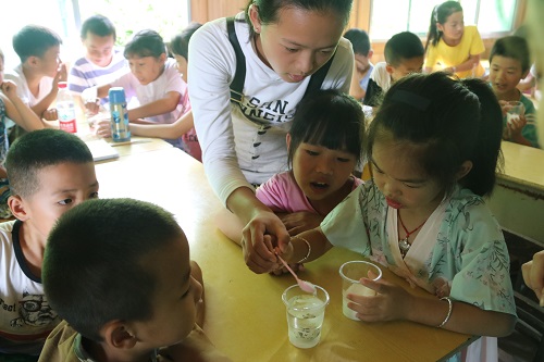 为拓宽当地员工视野,提升其学习能力,树立远大理想,团队设立除设立音乐、美术、体育等传统课程,还增加了丰富多彩的实验课,带领孩子们在亲自动手,探索科学背后的奥妙。音乐课上,“我和我的祖国,一刻也不能分割!”朗朗童声萦绕不绝,唱出了孩子和我们的心声。美术课上,剪纸、绘画、编绳一个不落,孩子们课间时间还沉浸其中。实验课上,将孩子们感兴趣的鹌鹑蛋,气球、小苏打等作为实验工具,从生活实例入手,为孩子们讲解浮力的产生与作用、淀粉遇碘变蓝的原理、复分解反应的奥妙等。孩子们纷纷被生动有趣的实验吸引。“看到孩子们一张张渴求知识的脸庞,我们再多的准备和付出都是值得的。”队员们如是说。