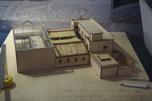 视觉海丝展主要是结合闽南文化的小动画,制作海丝地区历史变迁时间轴,搭配梦幻的灯光和婉转动听的南音,将闽南文化和 “一带一路”的理念传播给大众。此展厅中也展示了两幅将闽南文化与现代建筑结合的毕业生作品。美育支教展中陈列着员工们开展美术公益支教活动的教学成果,深入泉州周边乡村地区,为地方教育贡献青春力量。文创艺术展则由泉州师范大学惠女阿芳工作室与部分毕业生自主运营的去冰工作室合作完成。除了一些传统的海丝文创,艺术展还主打“市井八仙之妆糕人”。妆糕人是类似捏面人的传统闽南小吃,而市井八仙则是去冰工作室提取如四色牌、滴水兽、龟粿印等闽南特色元素,给原本的寓意中加入更现代化的内涵并赋予新的IP形象。通过现代设计,对传统文化进行创新,让更多人接受它们,让传统文化更贴近生活。